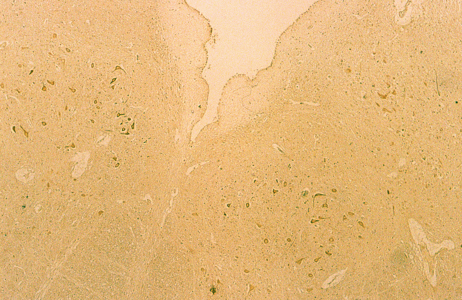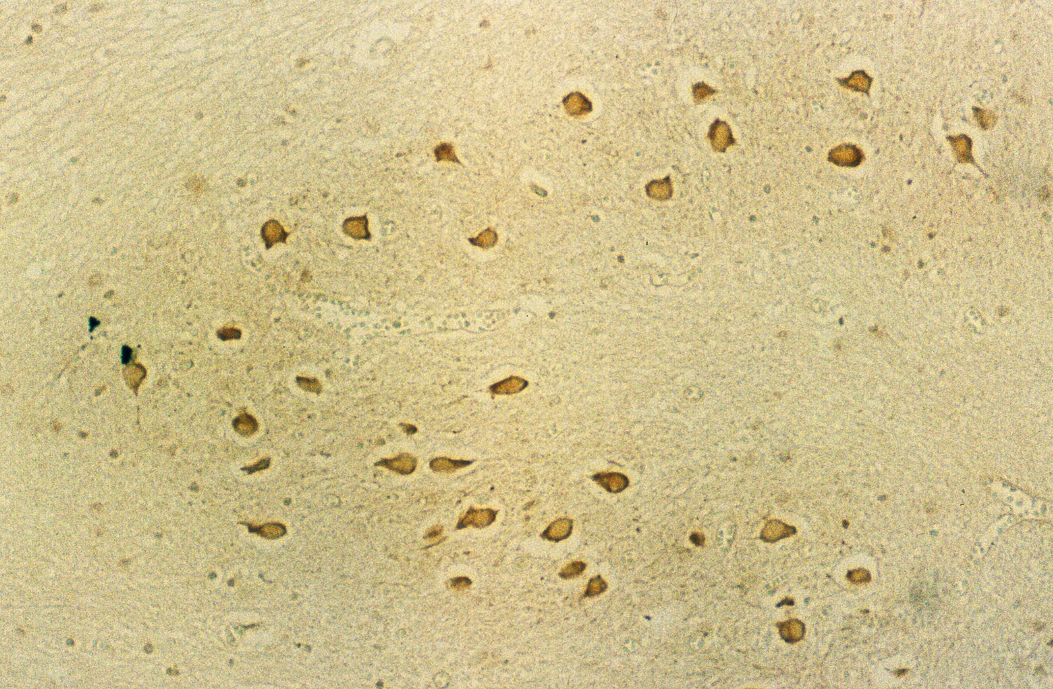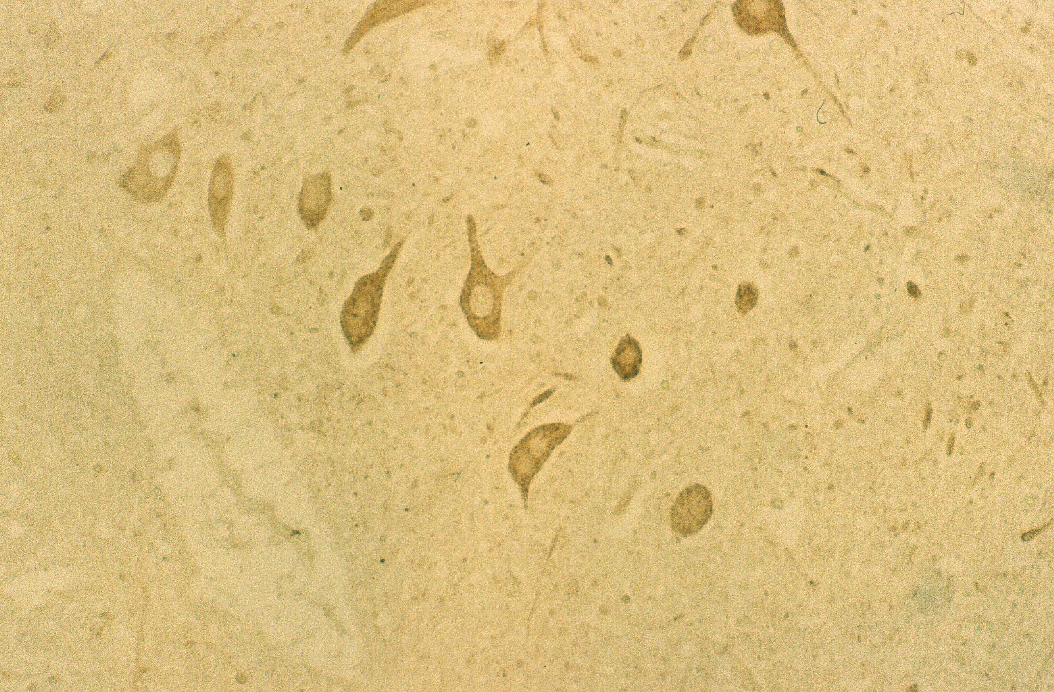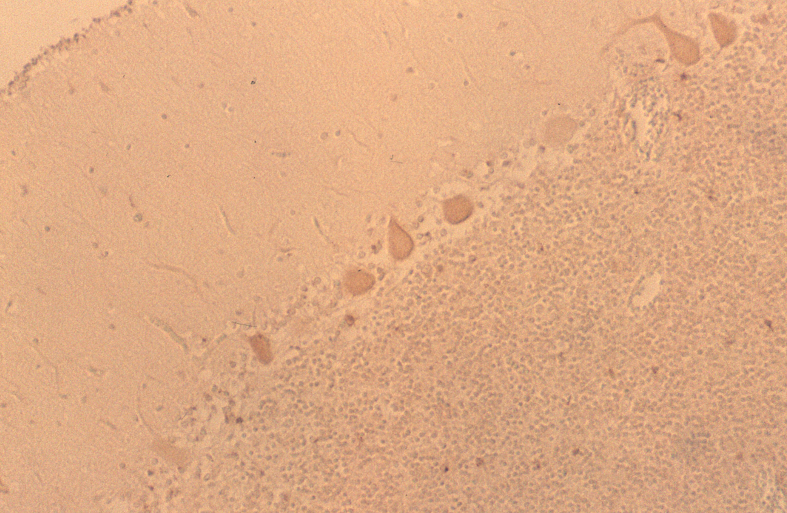 Figure 5 shows a case of DAB staining with anti-PGDS antibody in cerebellum. This individual had suffered from acute ischemia, falling unconscious and been in vegetative state for months before he passed away. The granular layer and molecular layer were loosely attached along Purkinje cells. There are some Purkinje cells visible but only one showed positive reaction to the anti-PGDS antibody (left in Fig. 5). And two cells showed condensed staining of anti-PGDS antibody (middle in Fig.5). Other Purkinje cells show no reactivity to anti-PGDS antibody. We think this was due to the brain damage followed by ischemia and hypoxia and the cell with the condensed staining may be undergoing/have undergone the apoptotic changes through the period of the vegetative state. Although this was the known history of hypoxia, we can also determine whether or not there was a brain damage in cases with suspected hypoxia.